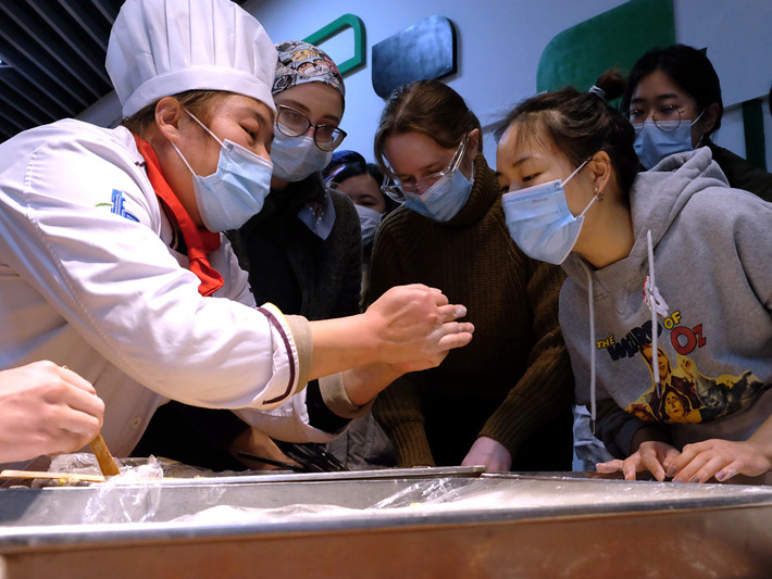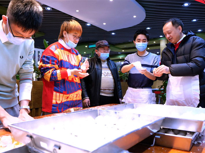 除夕晚的第一食堂充满了烟火气,学生与校领导、餐厅大厨一起包饺子、包汤圆、烹饪家乡菜,体验扎灯笼、编中国结等民俗活动,共同感受浓郁的节日氛围。